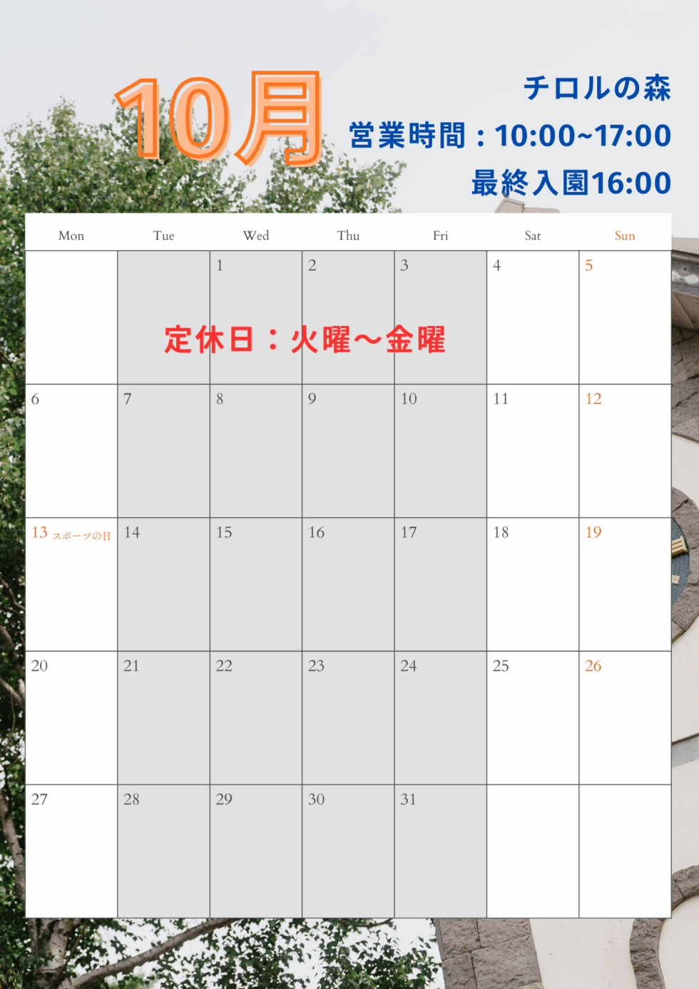 【お知らせ】 10月以降の休園日は毎週火・水・木・金となります。 お間違えの無いようお越しください。 皆さまのご来園心よりお待ちしております。